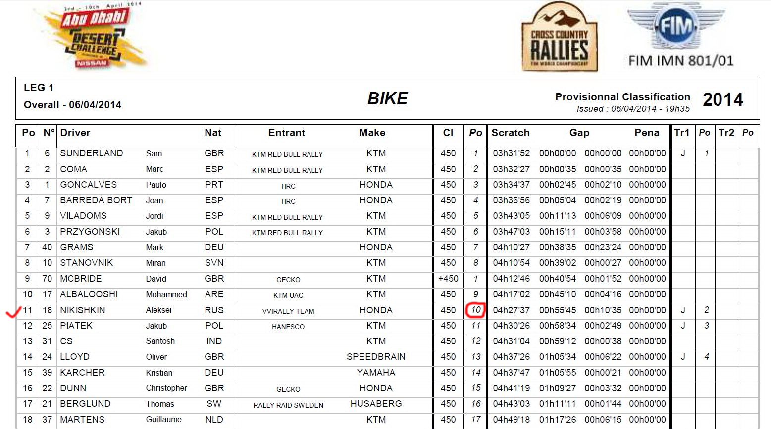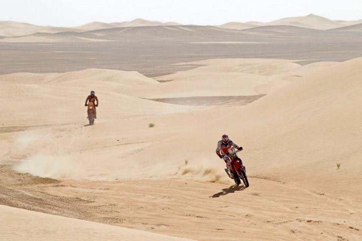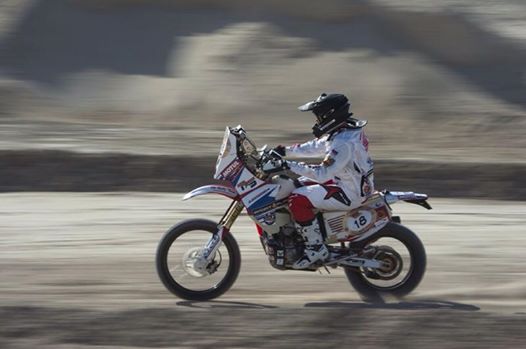Алексей Никишкин: «Нет, не жарко, но были проблемы с мотоциклом. Он практически развалился, кажется, оторвался бугель, который держит задний бак, пришлось ехать стоя 90 км. А так все отлично. С точки зрения навигации, хотя для меня это была первая гонка в мировых ралли-рейдах, проблем не испытывал, так как было много следов. В конце был тяжелый песок, очень мелкий, и в середине трассы мотоциклиста забрали на вертолете, не очень приятное зрелище было. Мотоцикл больше 140 км\ч не едет».
