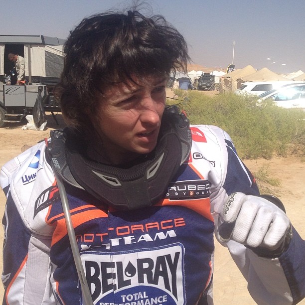 Алексей Никишкин: «Сложный был этап, один раз упал, ударился об мотоцикл лицом. Произошло на 190 км. Ехал-ехал, и вдруг земля ушла, дюны была как ступенька, не понял, но подлетел, мотик из-под меня вылетел  и я об него ударился.  Встал, все как в тумане было, как кино, но в замедленной съемке. Пришел в себя, шлем быстренько снял, и поехал. Еще сегодня была остановка на 20 минут. Там лежал мотоциклист, третий номер, поялк Якуб Пшигонски, он сломал руку или ключицу. Сам не смог встать, его на носилках забрали. Когда я подъехал, ему уже помогали -  квадроциклист поляк, Соник, и 25 номер на мотоцикле».