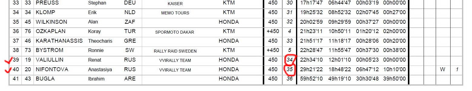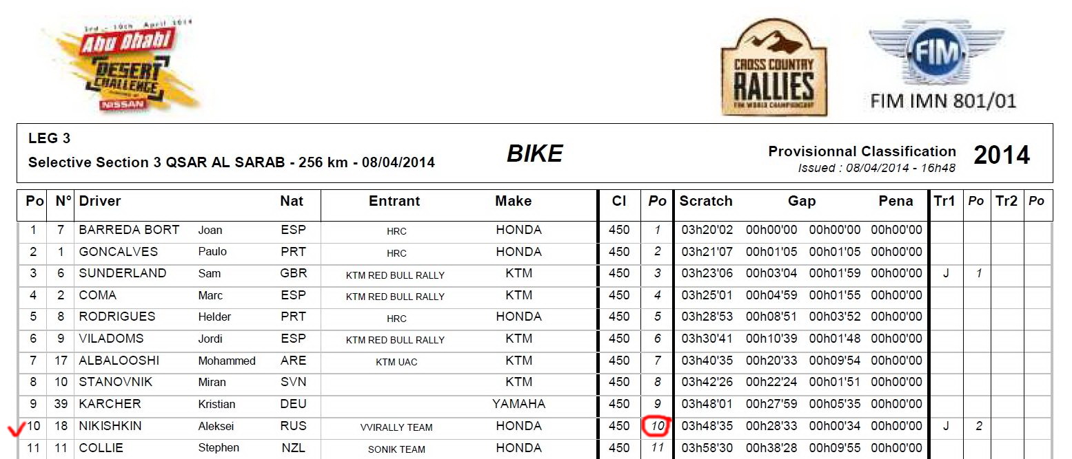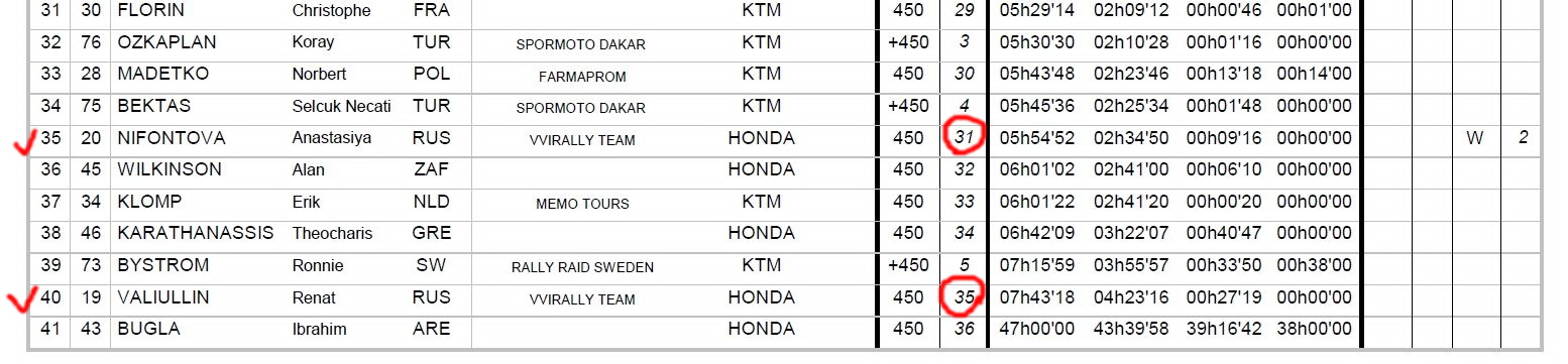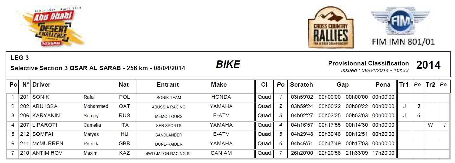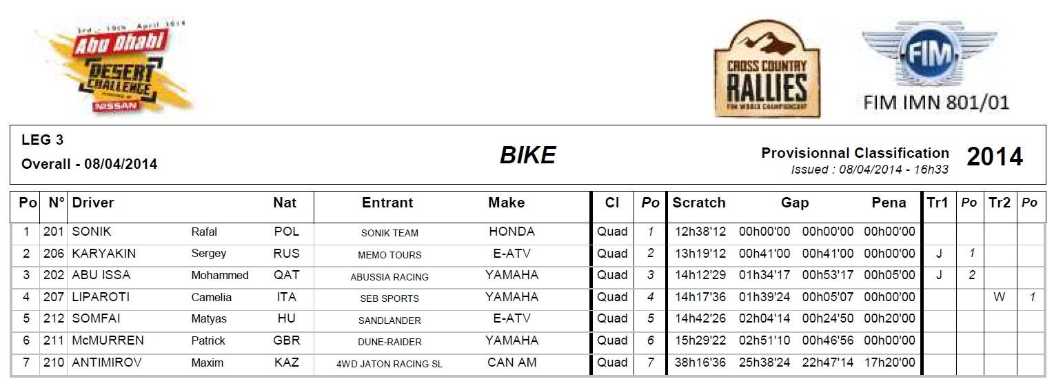 В зачете QUADпервое место по традиции опять занял лидер общего зачета Рафал Соник из Польши, российский гонщик Сергей Карякин показал третий результат и в общем зачете по-прежнему находится на второй позиции.