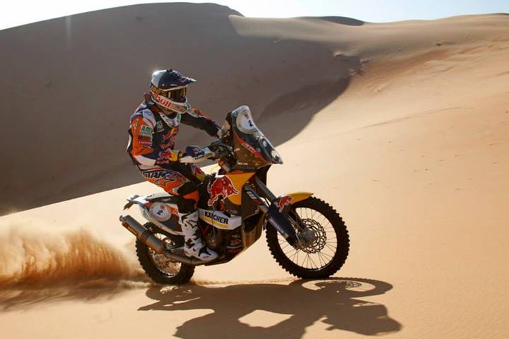 Сергей Карякин: "Трасса была намного интереснее, чем вчера, я хоть какое-то удовольствие получил. И пейзаж сегодня менялся, и дорога, и менялась конфигурация дюн. Были пологие, где можно было ехать быстро, были резкие, более-менее предсказуемые, были очень высокие, с большими падениями с них, были соляные озера, зелень, а не просто дюны-дюны как вчера. Сегодня у меня кончился бензин, так как отсоединился шланг от левого переднего топливного бака. Это было уже недалеко от дозаправки, километра два оставалось, но все равно, пока сам толкал, пока ждал, кто подтащит – минут 10 потерял. Хорошо, что это случилось не в дюнах. Потом нашел фитиль, соединил его и бензин стал поступать, это уже на заправке было. Заправил полный бак и поехал дальше. На втором участке после дозаправки я ехал полный газ, где-то 135 км/ч и вдруг резко подо мной дорога уходит вертикально вниз, я кое-как оттормозился, спрыгнул с дюны и приземлился где-то там внизу. Хорошо, что все прошло без последствий. Ехать здесь можно быстро, но никогда не знаешь, что тебя ждет.