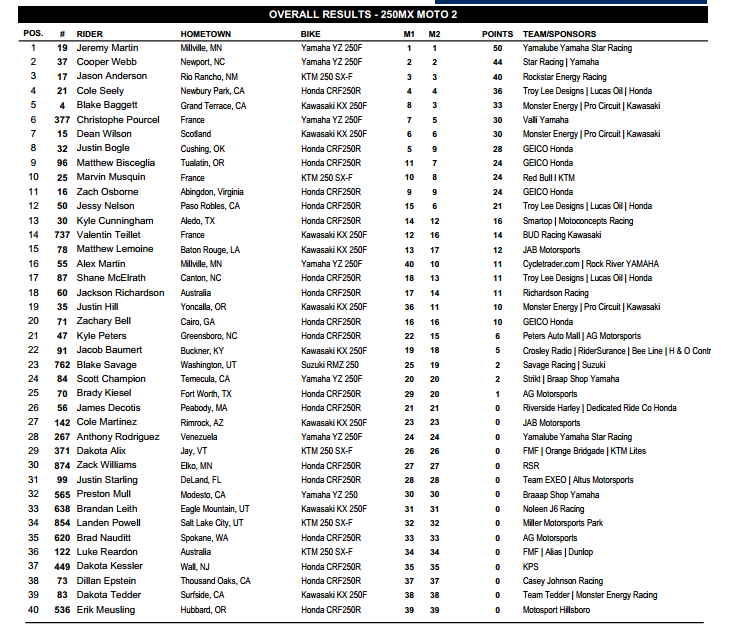 В классе 250сс убедительную победу одержал Джереми Мартин, выиграв оба заезда. Второе и третье места заняли Купер Вебб и Джейсон Андерсон.
