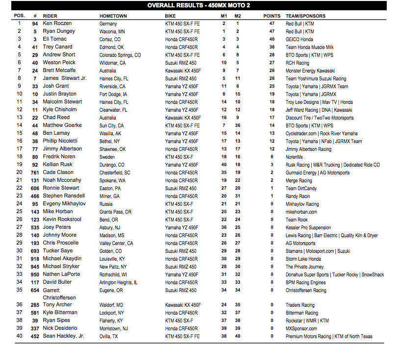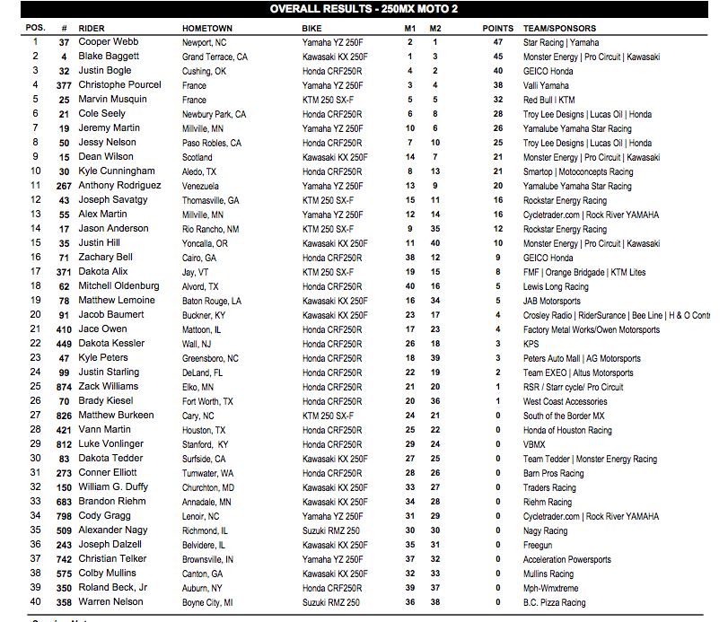 В классе 250сс победу одержал Купер Вэбб, второе и третье места заняли Блэйк Баггетт и Джастин Богл.