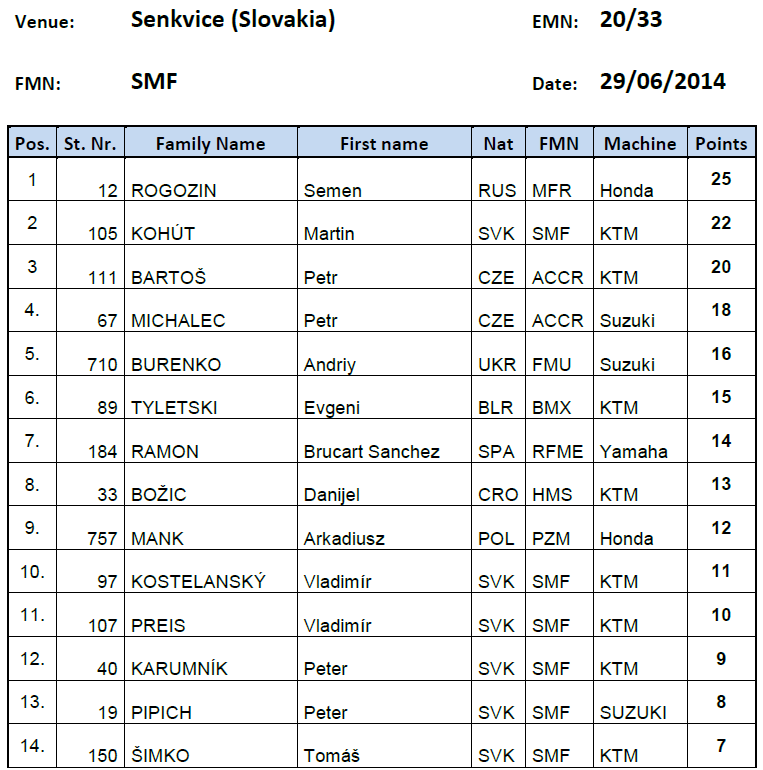 Победителем седьмого этапа Чемпионата Европы по Мотокроссу 2014 в классе ЕMX Open, который прошел в Сенквице (Словакия) в минувшие выходные, стал россиянин Семен Рогозин. В первом заезде Семен финишировал первым, опередив местного гонщика Мартина Кохута и чеха Петра Бартоша. Третье и четвертое места заняли чех Петр Михалец и украинец Андрей Буренко. Второй заезд был отменен из-за внезапного штормового ветра. Поэтому окончательные результаты этапа в классе EMX Open были определены по итогам первого заезда.