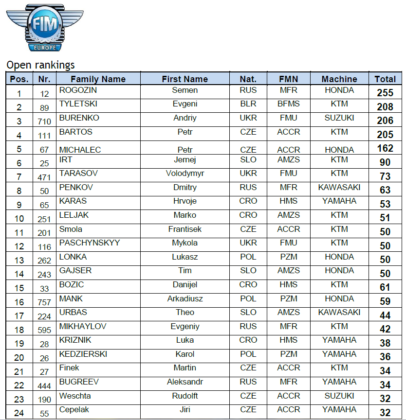 В общем зачете Чемпионата Европы по Мотокроссу в классе ЕMX Open Семен Рогозин совсем близок к тому, чтобы стать чемпионом. Заключительный этап состоится 5-6 июля в Словении.