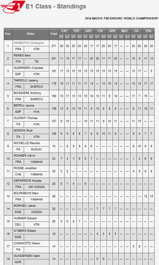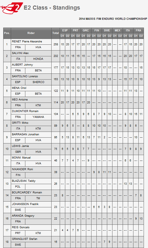 Что касается общего зачета серии в классах Е1 и Е2, тот тут чемпионами мира досрочно (еще на прошлом этапе) стали французские гонщики Кристоф Намботин на КТМ и Пьер-Александр Рене соответственно.