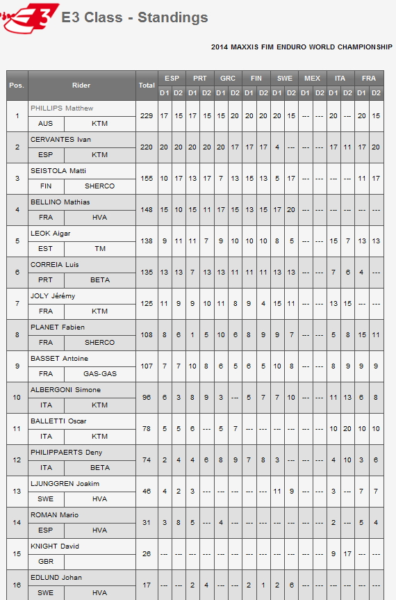 После заключительного этапа стало известно имя чемпиона мира в классе Е3, им стал австралиец Мэттью Филлипс, опередив на девять очков испанца Ивана Сервантеса.