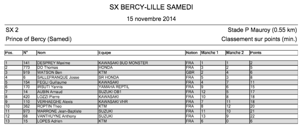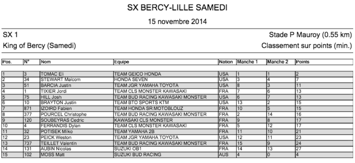 В первый вечер соревнований в классе SX1 не было равных американскому кроссмену Эли Томаку, он же стал и "Королем Берси". В младшем классе (SX2) сильнейшим оказался новоиспеченный "Принц Берси", французский гонщик Максим Депрэ.