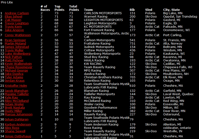 В младшем классе общая победа на первом этапе досталась Эндрю Карлсону на Polaris, хотя он и не выиграл ни одного финала. А героем первого этапа стал 16-летний норвежец Элиас Ишоел, выступающий на Ski-Doo, который выиграл субботний финал, а в воскресенье из-за падения показал лишь девятый результат, как итог у него второе место по результатам двух дней соревнований.