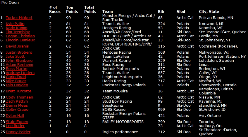 Победитель в главном классе, можно сказать, был уже известен заранее. Им стал прошлогодний победитель серии, восьмикратный чемпион Америки и самый титулованный гонщик - Такер Хибберт выступающий на Arctic Cat . Он выиграл все четыре отборочных заезда, а также два финала в субботу и воскресенье.