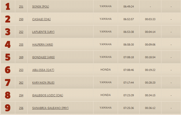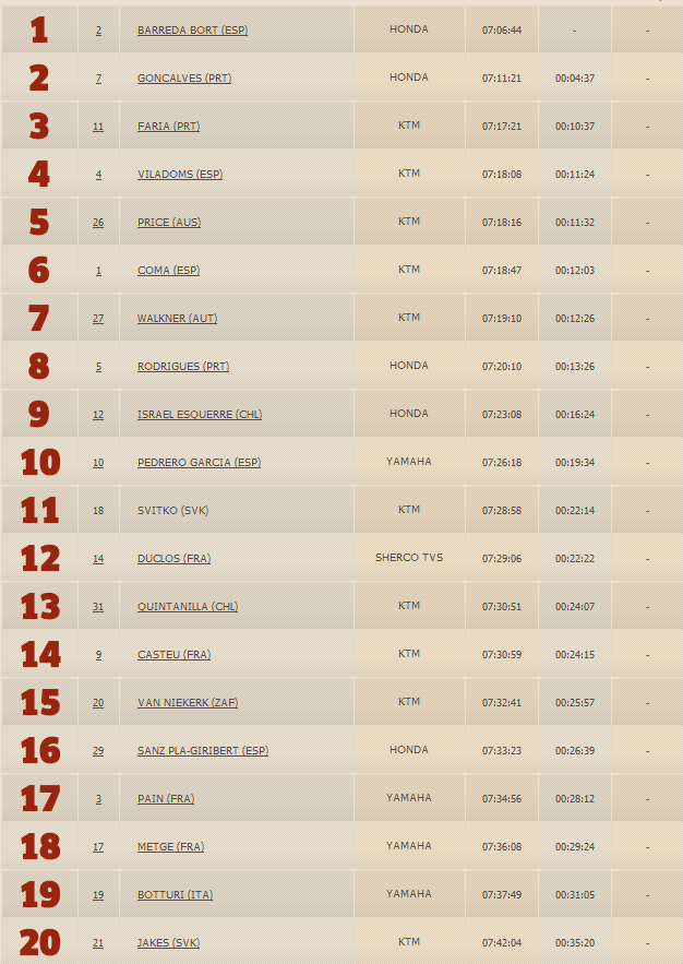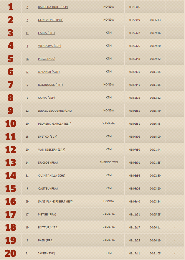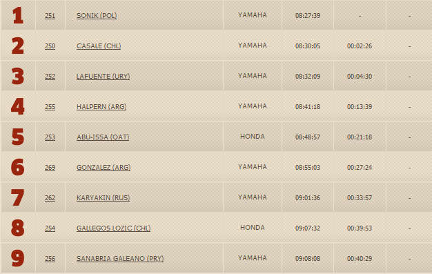 Еще один представитель команды Honda Гельдер Родригес финишировал седьмым. А вот победителям первого этапа, гонщикам КТМ не повезло: Марк Кома проиграл 12 минут относительно лидера из-за пробитого колеса и финишировал лишь восьмым, а Сэм Сандерлэнд сбился с маршрута и "проблудил" более двух часов, закончив второй этап лишь 72-м.