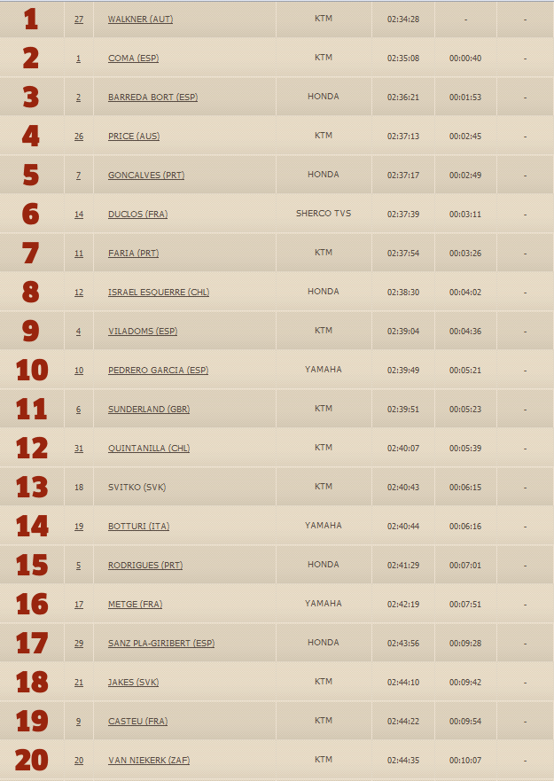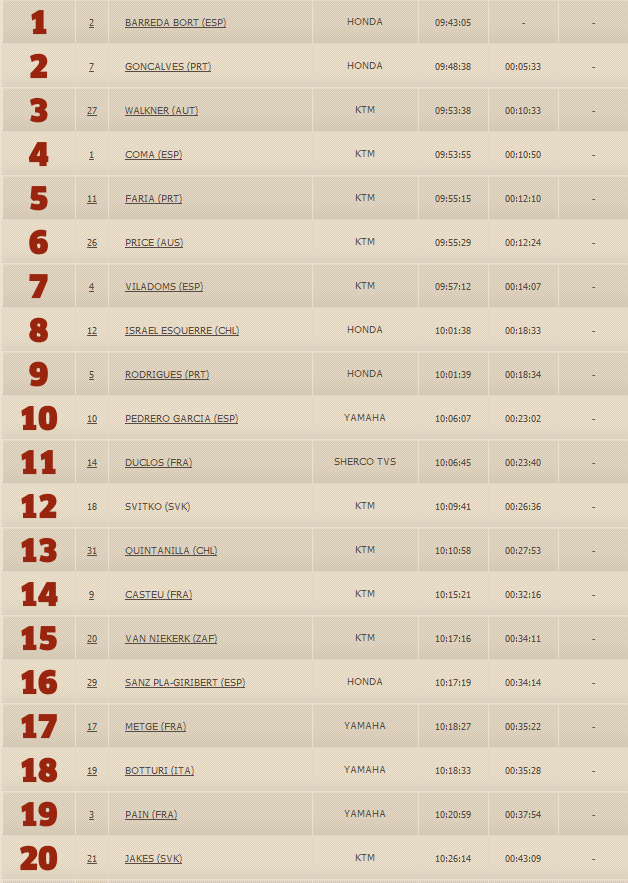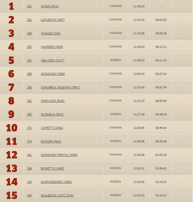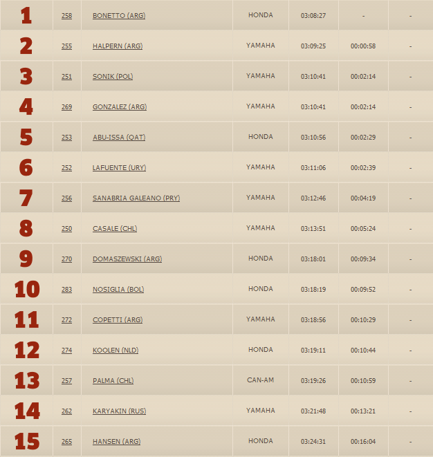 Победу на этапе одержал Лукас Бонетто, выступающий на квадроцикле HondaTRX 700. Вторым закончил дистанцию его соотечественник Себастьян Хэлперн на Yamaha. Замкнул тройку сильнейших, победитель вчерашнего этапа – поляк Рафаль Соник.