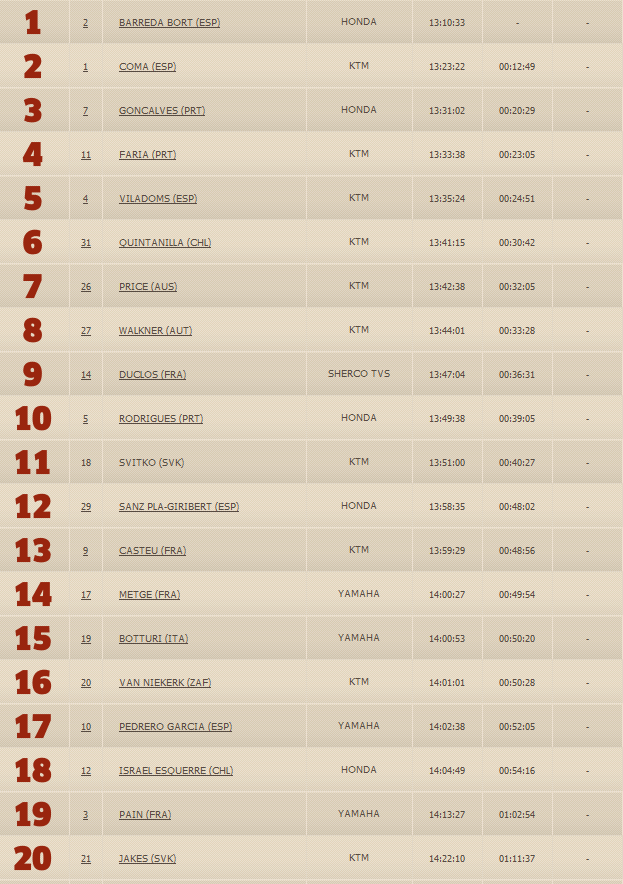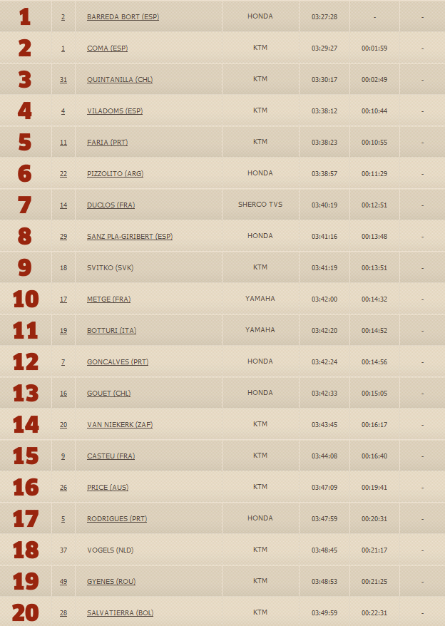 Марк Кома второй, третий – представитель Чили – Пабло Квинтанилла. Не повезло 28 –летнему дебютанту ралли-марафона и победителю третьего этапа Маттиасу Валькнеру, он закончил этот СУ лишь двадцатым.