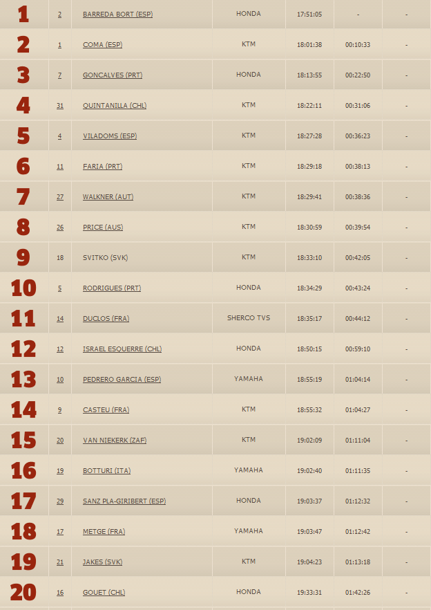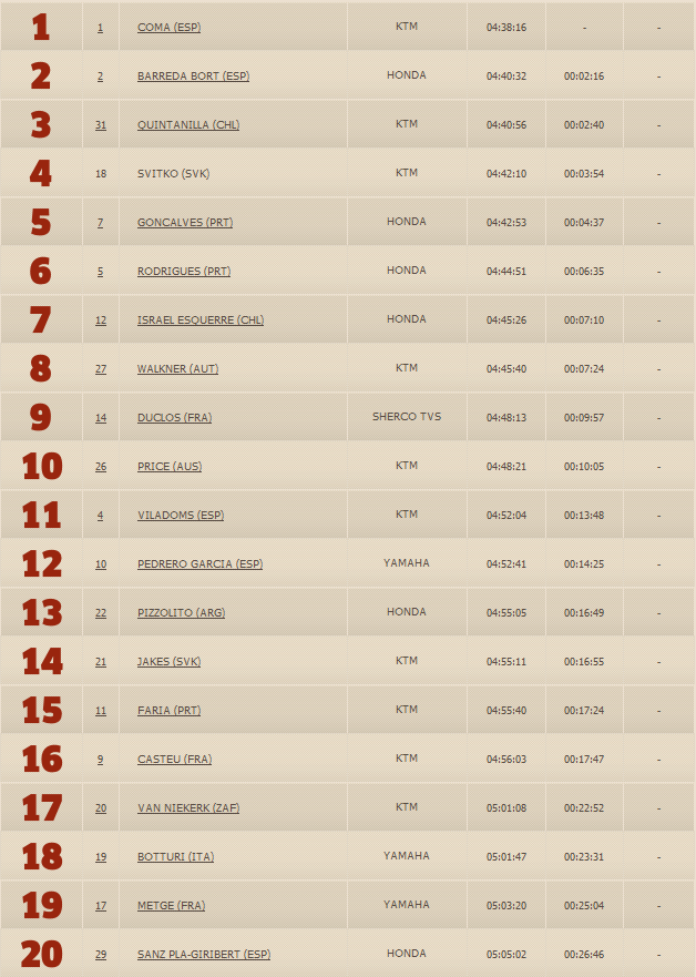 В зачете МОТО первое место вновь у гонщика КТМ.