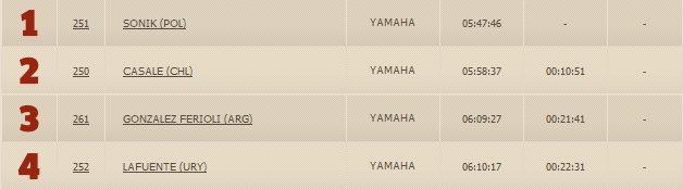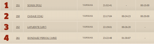 Лидер общего зачета поляк Рафаль Соник вновь одержал победу, вторую подряд и уже третью по счету на этапах Дакара 2015. Второе место занял чилиец Игнасио Касале, третьим финишировал 18-летний представитель Аргентины – Гонзалес Фериоли.