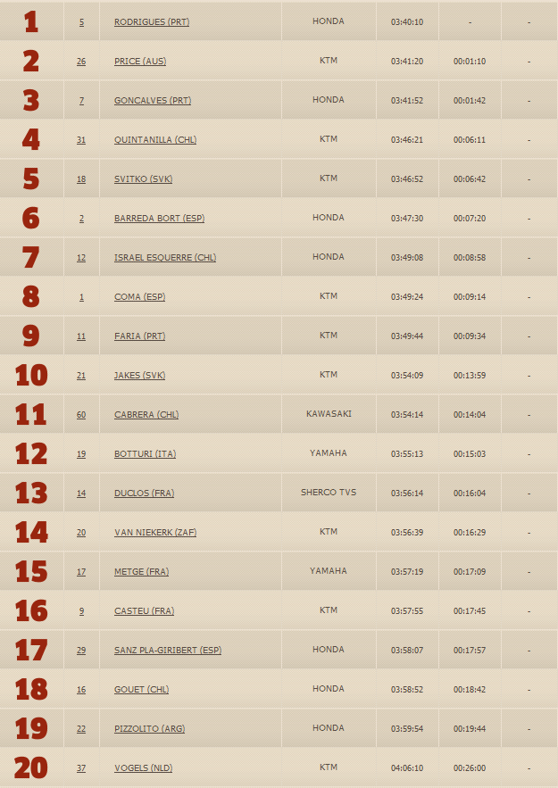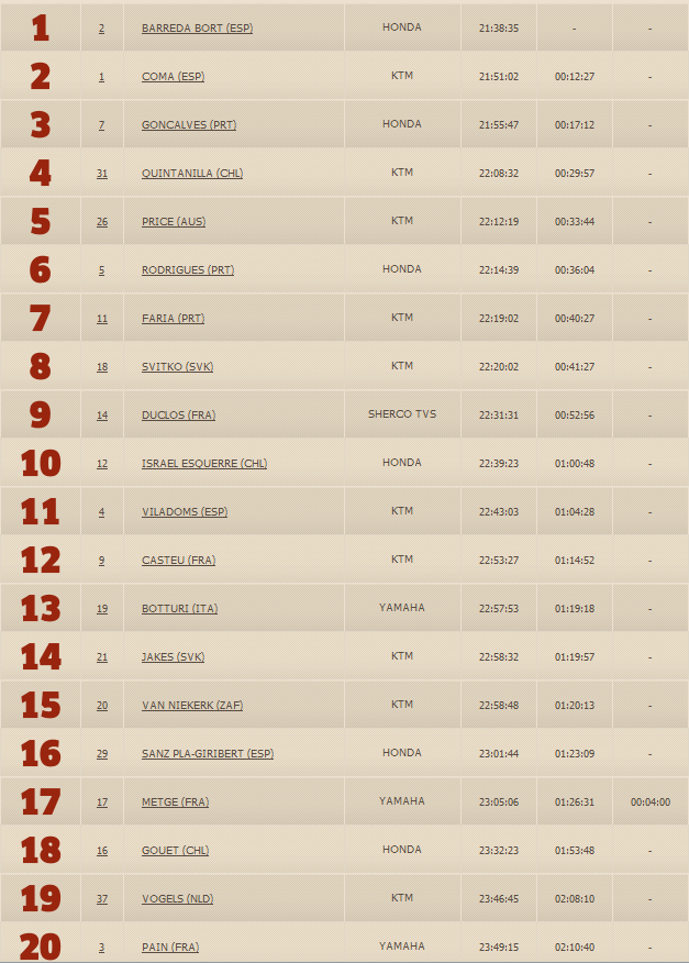 Лидеры общего зачёта испанцы Хоан Барреда Борт и Марк Кома выбрали неверное направление на 130-м километре спецучастка и финишировали шестым и восьмым соответственно с отставанием в семь и девять минут от победителя. Однако это не повлияло на расстановку сил в общем зачёте — Барреда Борт сохранил лидерство, увеличив отрыв от идущего вторым Комы до 12 минут.