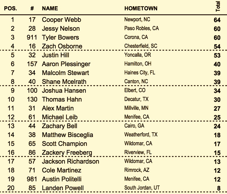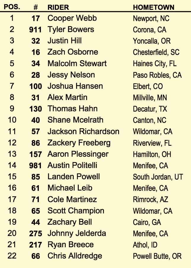 Победителем в классе SX Lites Западного региона стал Купер Вэбб, второе место у Тайлера Боуэрса, а третьим финишировал Джастин Хилл.