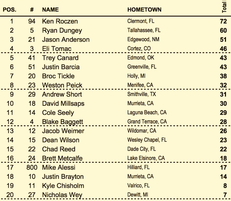 В классе SX сильнейшим оказался Кен Рокзен и это его уже вторая победа в сезоне. Второе и третье места заняли Райан Данжи и Элай Томак.
