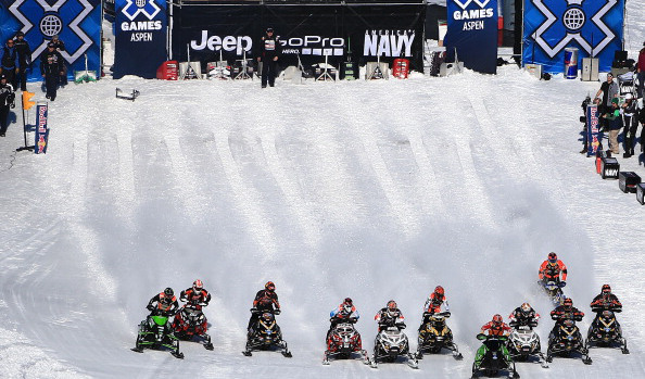 ASPEN, CO - JANUARY 27: Racers leave the start in the Snowmobile Snocross at Winter X Games Aspen 2013 at Buttermilk Mountain on January 27, 2013 in Aspen, Colorado. (Photo by Doug Pensinger/Getty Images)