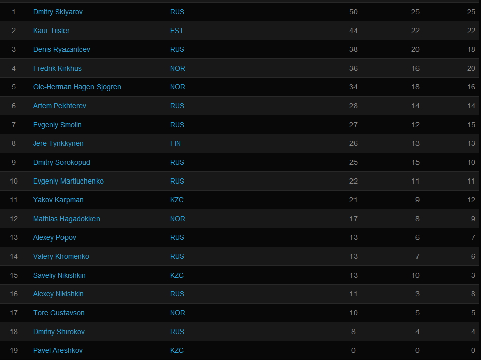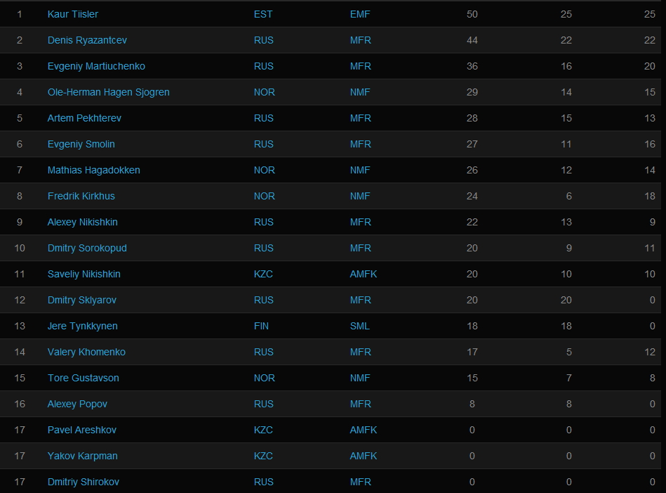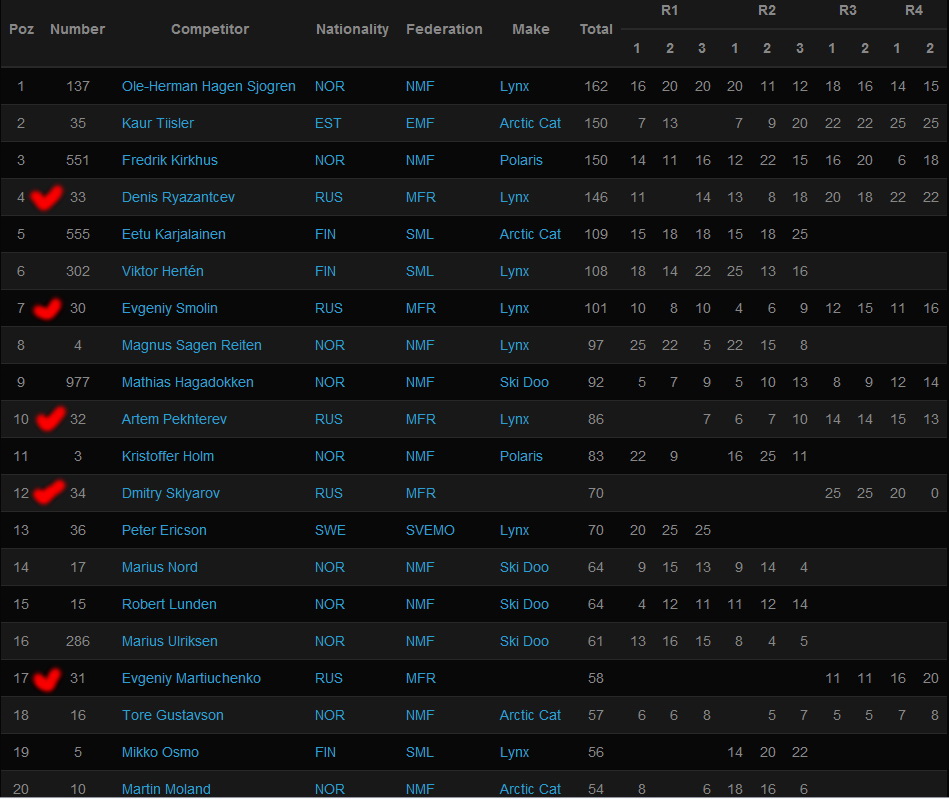 Ну, а Чемпионом Европы стал Оле-Херман Хаген Сёгрен на снегоходе Lynx (Норвегия- 162 очка). Он самый юный чемпион – ему 18 лет. Серебряный призёр - Каур Тиислер из Эстонии (150 очков), бронзовым призёром стал норвежец Фредерик Кирхус выступающий на снегоходе фирмы Polaris (150 очков). По итогам чемпионата самым результативным российским гонщиком оказался Денис Рязанцев у него четвертое место.