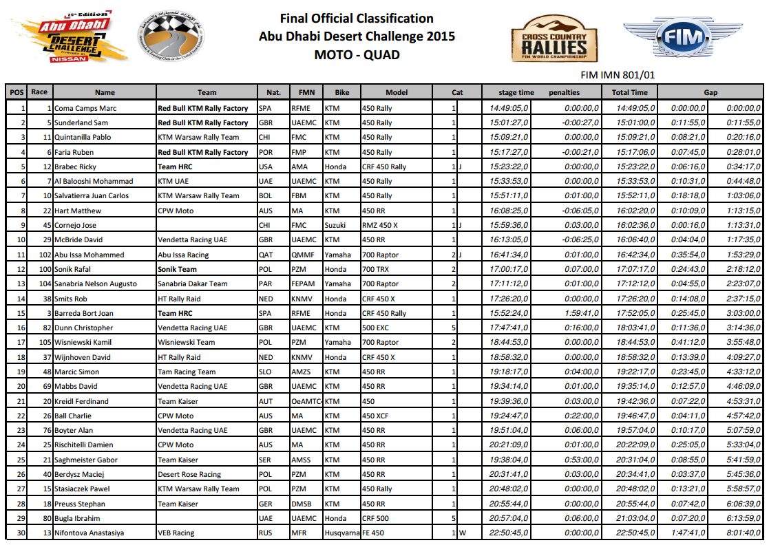 Победителем гонки в зачете мотоциклов стал Марк Кома (КТМ), и это его уже восьмая победа в Abu Dhabi Desert Challenge
