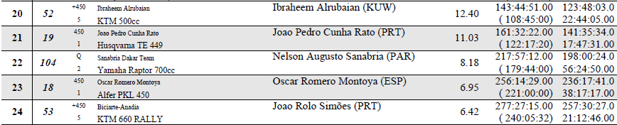 В джипах именно финальный спецучасток решил судьбу подиума. За 20 км до финиша с техническими проблемами на трассе остался Язид Аль-Раджи (Тойота), занимавший второе место. Российский дуэт Владимира Васильева/Константина Жильцова (Мини) сработал профессионально и финишировал с третьим временем на спецучастке, завоевав по итогам гонки «серебро». Победителем гонки, как и в прошлом году, стал Нассер Аль-Аттия/Маттье Бомель (Мини). Тройку лучших замкнул Рейналдо Варела/Густаво Гужелмин (Тойота). Два экипажа команды Mobilexзавершили гонку в топ-10, заняв 7-е и 9-е места. В Т2 победил Максим Кирпилев/Андрей Рудницкий.