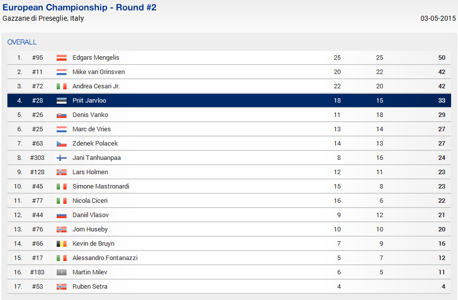 Менгелис лидирует в чемпионате с максимальным количеством очков после двух этапов (100), в то время как Цезари расположился на второй позиции с 84 очками. У чемпиона 2014 года, Майка Ван Гринсвена 75 очков и он на третьей позиции. Даниил Власов в общем зачете после 2-х этапов на 11-м месте