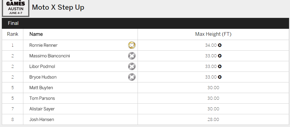 4 июня в Остине стартовали летние экстремальные игры - Summer X-Games 2015. В первый день соревнований в категории МОТО-Х Step Up (прыжки в высоту) золотая медаль досталась Ронни Реннеру, который прыгнул на высоту 10,36 метра.