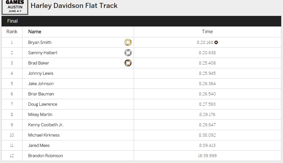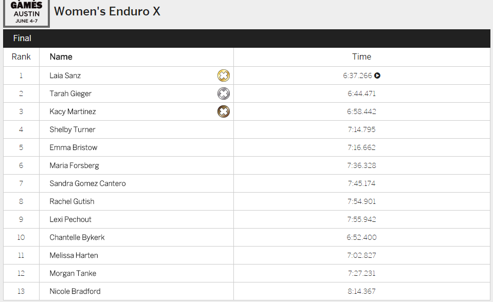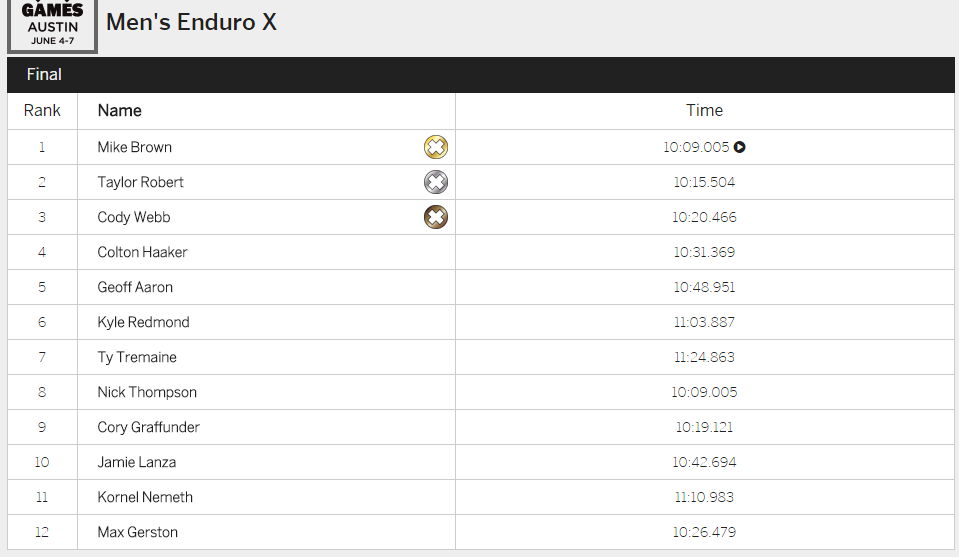В категории Men's Enduro X победителем и обладателем "золота" стал ветеран американского мотокросса Майк Браун. Серебряная медаль досталась Тэйлору Рлоберту, а "бронза" Коди Вэббу. В женском зачете золотая медаль у Лайи Санз.