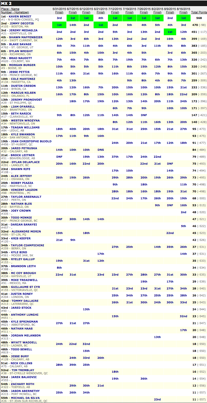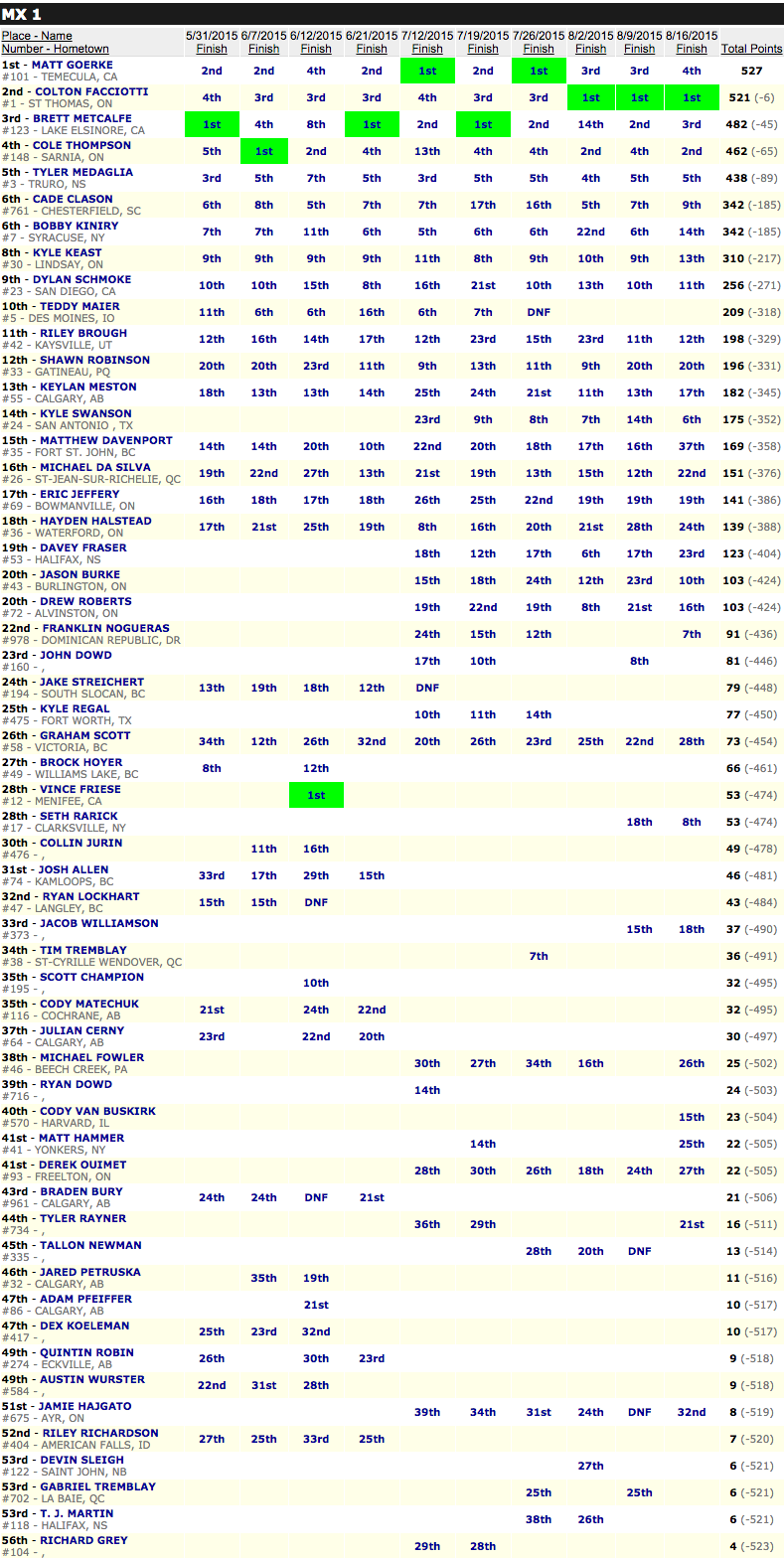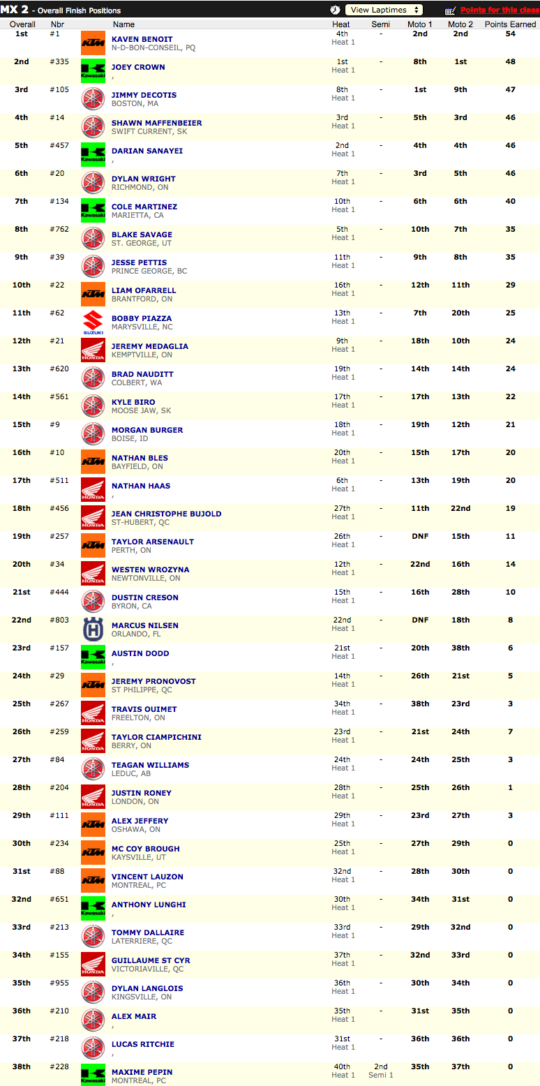 Подведем итоги чемпионата в классе МХ2: Кавен Бенот -Чемпион Канады 2015, второе и третье место у Джимми Дэкотиса и Джереми Медаглиа.