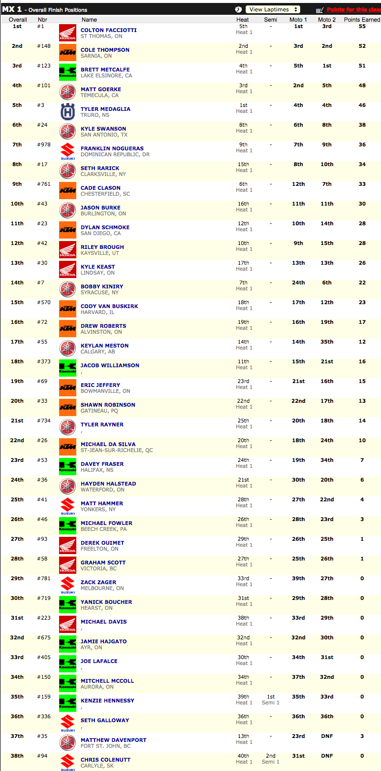 В минувший уик-энд в Уолтон прошел заключительный, десятый этап Чемпионата Канады по мотокроссу 2015. Победителем в классе МХ2 стал Кавен Бенот, он же Чемпион Канады 2015 в "младшем" классе. Колтон Фаччиотти одержал победу в классе МХ1.