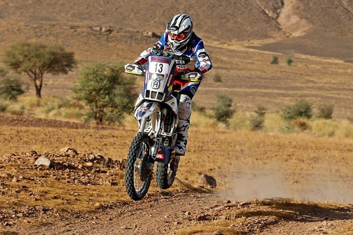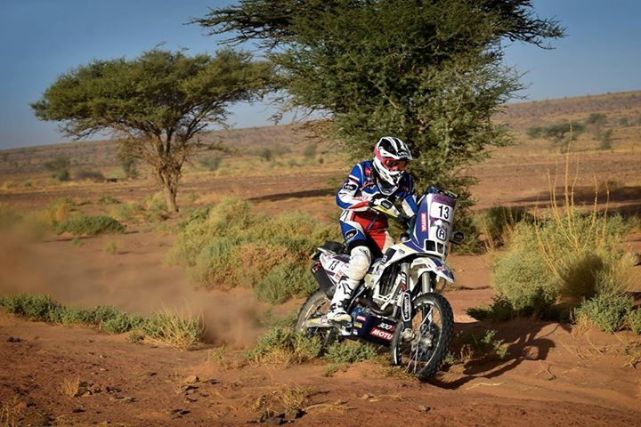После 80км лиазона был дан старт на первый спец участок длинной около 370км. В первый день организаторы предложили нам сплошные камни и никакого песка. Как обычно, я с самого начала старалась не заводиться и не спешить. Нужно очень аккуратно вкатиться, чтобы набрать правильный ход и поймать ритм гонки. В целом, был очень приятный скоростной СУ, с одной ложкой дегтя в виде пыли, которая стояла в воздухе и в безветрие совершенно не хотела открывать обзор дороги для быстрой езды. Особенно это почувствовалось во второй половине трассы, когда нас стали догонять лидеры авто зачета. Регулярно приходилось останавливаться практически до нуля и пережидать пока пыль хоть немного уляжется. Еще одно расстройство у меня случилось из-за моих непослушных шейных позвонков. На камнях сильно набило шею и за 80км до финиша начала сильно болеть голова. Естественно, концентрация упала и темп пришлось немного сбавить, да и сама трасса стала чуть более сложной и разбитой. Но, не смотря ни на что, я финишировала вполне довольная на 35м месте в общем зачете из 84 участников. В этот день не повезло команде Sherco. Ребята встали из-за технических неполадок. Так же были проблемы у итальянца Алессандро Боттури на ямахе и, к моему огромному сожалению, так же из-за проблем с мотоциклом не финишировала Лайя Санц. Хотя до того, как ее настигла эта неприятность она уверенна шла на шестой!!!! позиции в общем зачете.