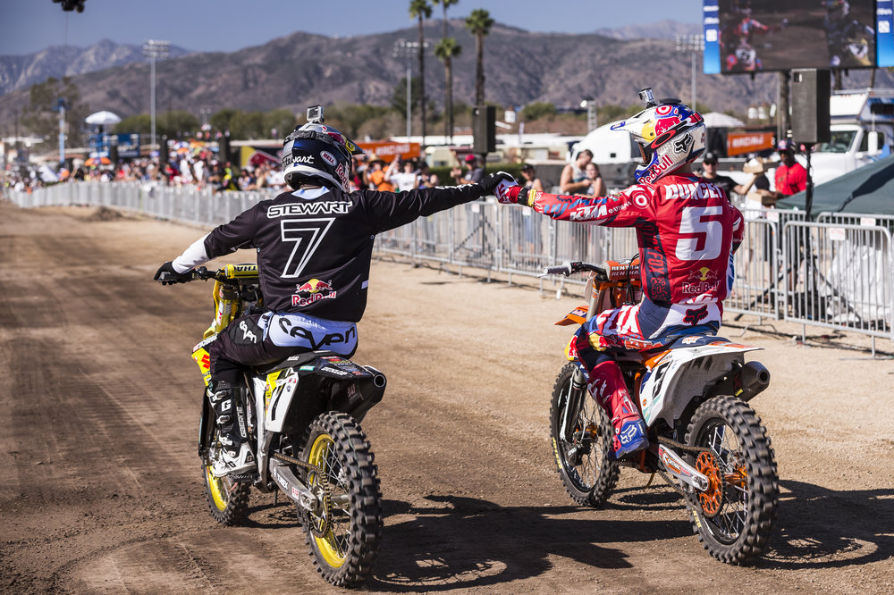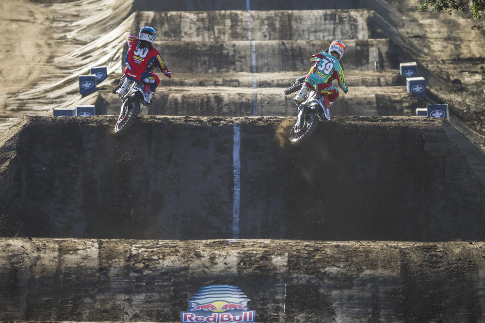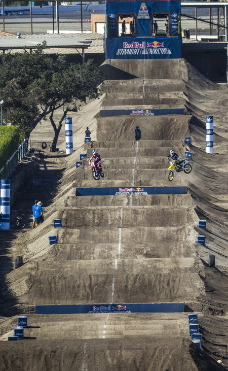 (L-R) James Stewart and Malcolm Stewart in action at the Red Bull Straight Rhythm testing session at Thing Ranch in Alpine, California, USA on 10 October, 2013.