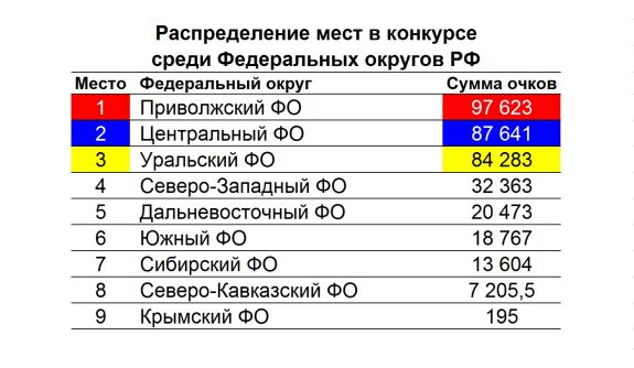 Среди федеральных округов первое место занял Приволжский ФО, за ним – Центральный ФО и Уральский ФО. Дополнительно подсчитаны очки за призовые места в чемпионатах мира и Европы. Тут на первом месте Республика Башкортостан – 3200 очков, на втором – Самарская область – 2960, на третьем – Московская область (1190), далее – Москва (1000), Калужская область (800), Краснодарский и Приморский края – по 630.