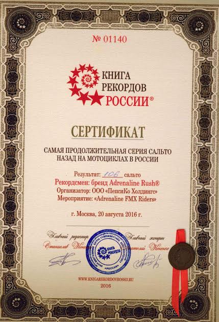 Кульминацией Adrenaline FMX Riders стала установка нового рекорда России. В рамках совместного выступления в заключительном шоу-блоке всемирно известные райдеры выполнили беспрецедентную по продолжительности безостановочную серию бэкфлипов***. С формулировкой «Самая продолжительная серия сальто назад на мотоциклах в России» новым рекордом России стал результат 106 бэкфлипов!