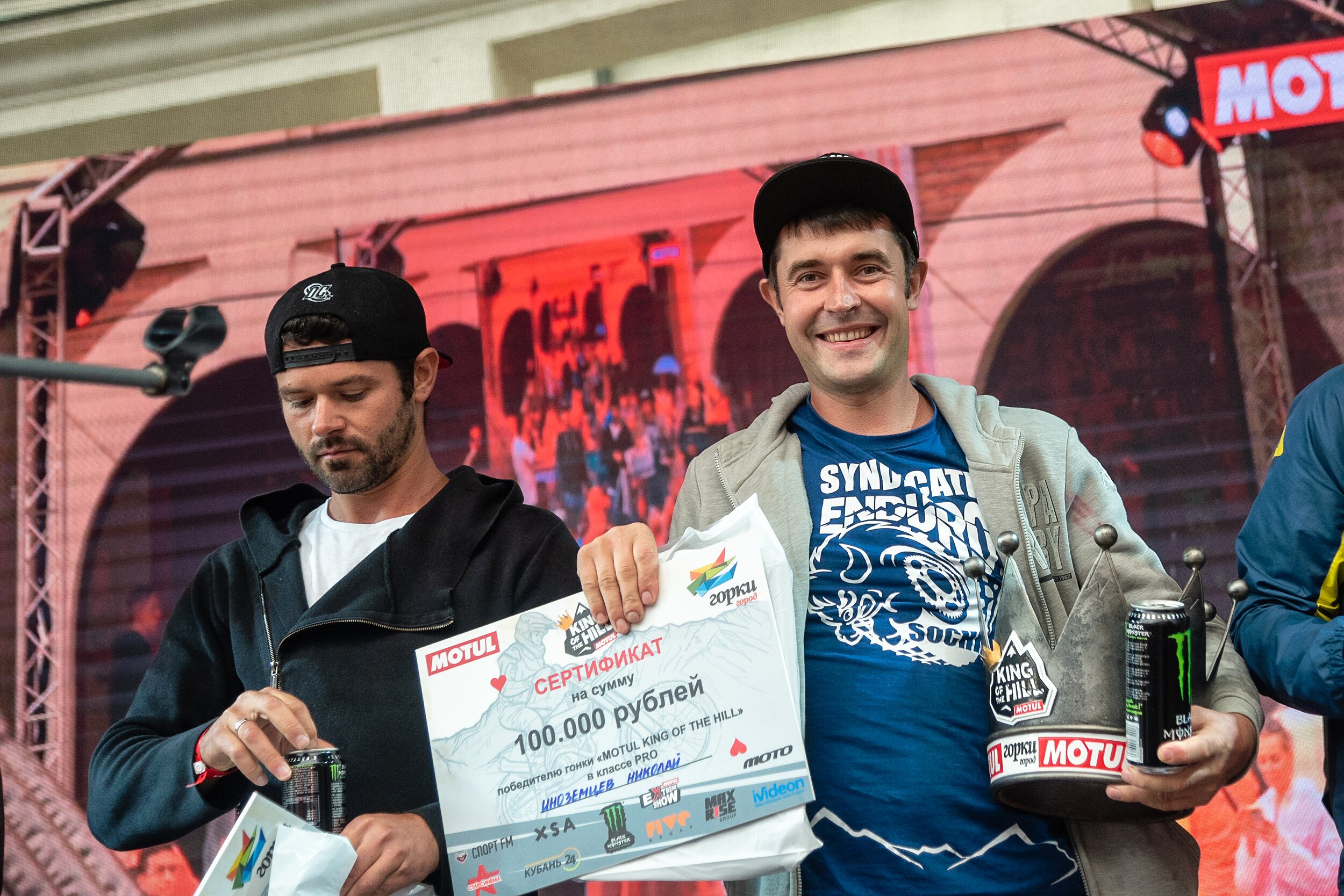 Общая протяженность горного маршрута гонки Motul King of the Hill составила больше 20 км с перепадом высот между стартом и финишем в 1500 метров. Из-за прошедших накануне проливных дождей отдельные участки трассы стали крайне сложными для проезда. До пика Черная пирамида на высоте 2340 метров над уровнем моря добралась только треть участников. Лидером гонки, как и в прошлом году, стал гонщик из Сочи Николай Иноземцев – он поднялся на финишную площадку за 1 час и 20 минут. Вторым спортсменом, покорившим вершину за 1 час 31 минуту, стал москвич Александр Иванютин. Тройку сильнейших замкнул Михаил Гаврилов из Геленджика, финишировавший спустя 6 минут после Иванютина. Победителю досталась корона «Короля горы» и крупный денежный приз от организаторов. Не остались без внимания и спортсмены, финишировавшие в первой десятке – их ждали ценные подарки от партнеров гонки.