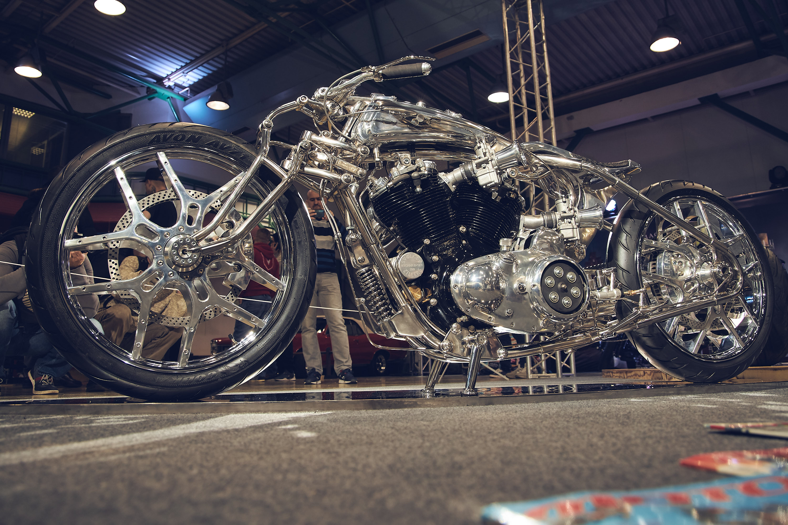 Как обычно большим интересом пользовалось Custom&Tuning Show, которое 13 лет назад родилось в стенах "Экспоцентра". Как и предполагалось, чемпион мира Дмитрий Голубчиков оказался вне конкуренции и большинством судейских голосов в третий раз подряд стал чемпионом России. В его Vincent гармонично сложились воедино редкость донора, оригинальность дизайна и техническая сложность конструкции. Удивительным образом в первую пятёрку попал бешеный самокат из Ижевска с приводом на переднее колесо от перевёрнутого скутерного мотора. Всего в кастом-зоне собралось более 60 мотоциклов на любой вкус. Разнообразили кастом-павильон велосипеды из музея Андрея Мятиева, в том числе редчайшие деревянные машины, с которых 150 лет назад начиналось развитие двухколёсного транспорта, а также коллекция растабайков.