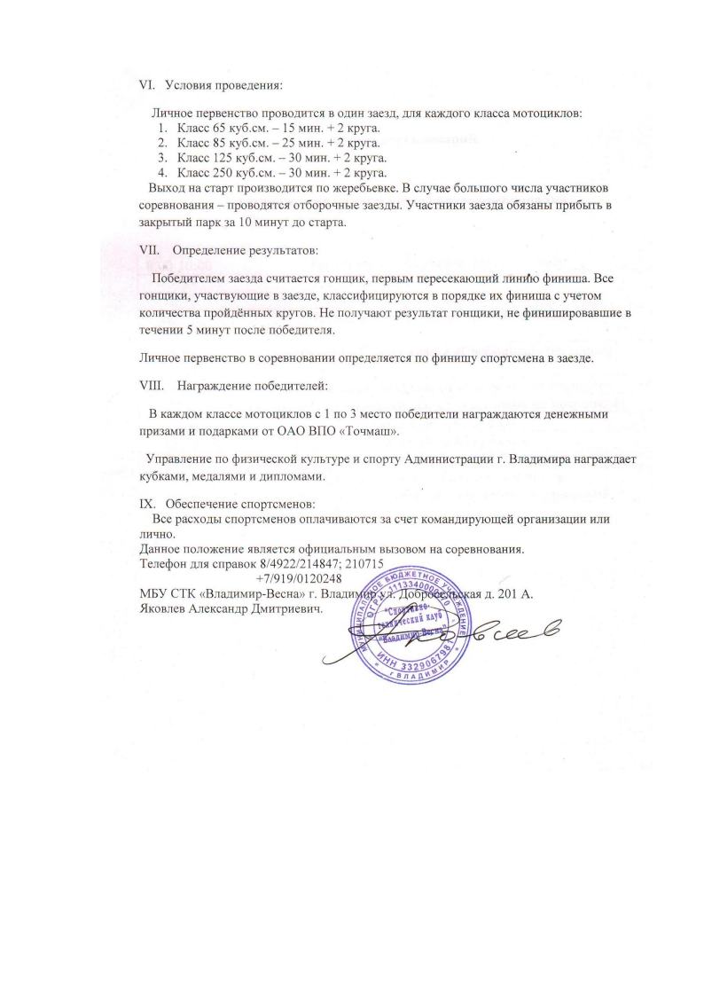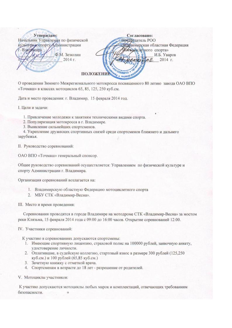 МОТОКРОСС г. Владимире 15 февраля 2014 года 15.02.2014 Ronald Jeremy Hyatt Межрегиональный мотокросс в честь 80-летия завода "ТОЧМАШ"состоится в г. Владимире 15 февраля 2014 года. Организатор мероприятия - спортивный клуб "Владимир-Весна" (Яковлев А.Д., тел. 8-9190120248).Положение о соревнованиях Комментарии Комментарии к этой статье запрещены.
