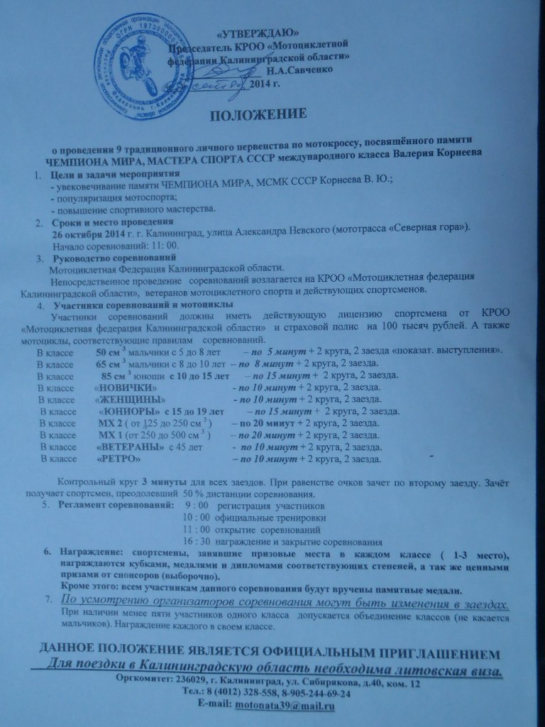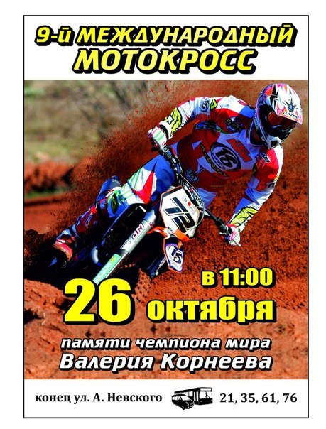 26 октября - 9-й Международный мотокросс памяти Валерия Корнеева. 26.10.2014 г.Калининград Комментарии Комментарии к этой статье запрещены.