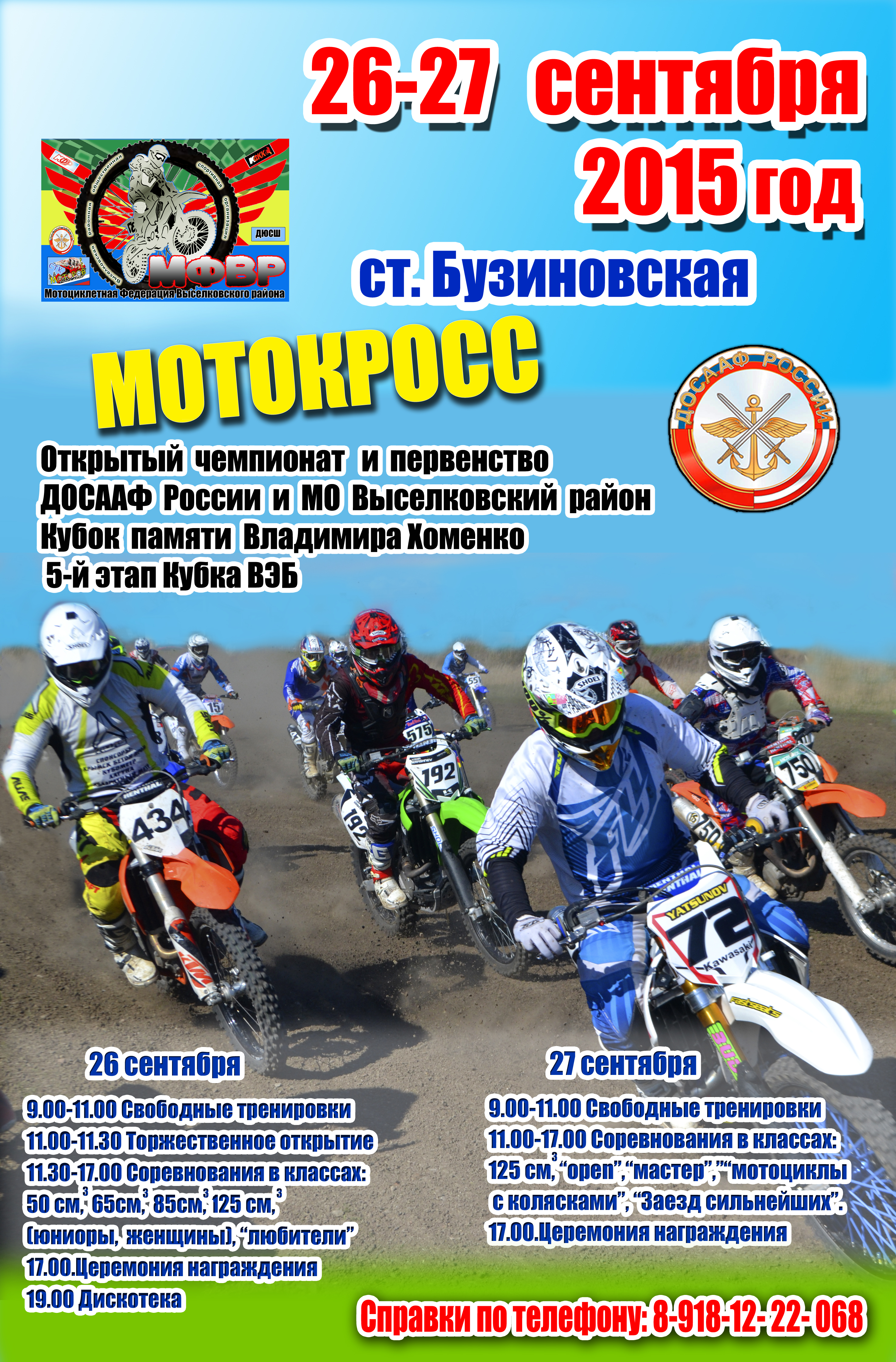 25-27 сентября - Мотокросс в ст.Бузиновская (Краснодарский край) 25.09.2015 Станица Бузиновская, Выселковского района, Краснодарского края. Комментарии Комментарии к этой статье запрещены.