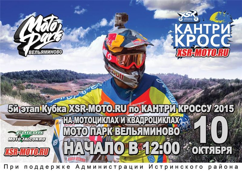 10 октября состоится 5-й финальный этап Кубка XSR-MOTO.RU по Кантри Кроссу 2015. Соревнования пройдут на новом месте - Мотокросс Парке Вельяминово, в рамках презентации-открытия Парка. Кроме Кантри Кросса зрители увидят еще и "ночные" соревнования Кубка по Эндурокроссу. Вход для зрителей - свободный. Место проведения: Московская область, Истринский район, д. Вельяминово, «Мотокросс Парк Вельяминово».