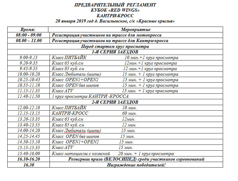 -чтобы успеть провести по 2 заезда в мотокроссе, во всех классах будет круг просмотра (а не длинная тренировка), старт гонки уже в 9:00. Смотрите расписание. Не опаздывайте, приезжайте с запасом по времени!