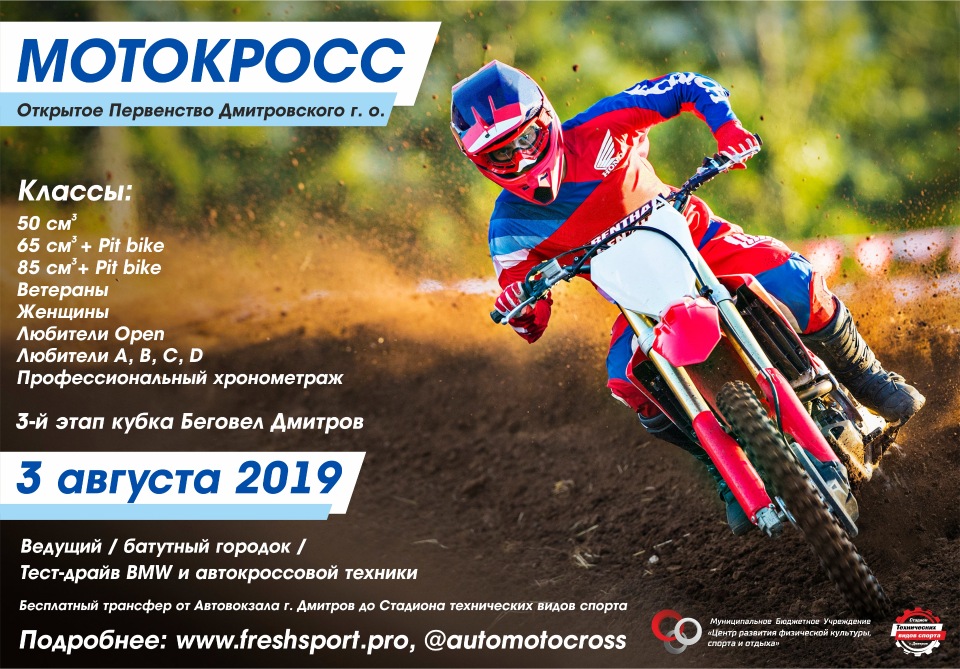 3 Августа 2019 года в городе Дмитров, на трассе Центра технических видов спорта пройдет 3й Этап Любительского кубка  АБСД (открытое первенство Дмитровского муниципального района по мотокроссу). Классы 50/65/85/Pit Bike/Ветераны A,B,C/Open A,B,C,D/ Женщины Предварительная онлайн регистрация по ссылке: